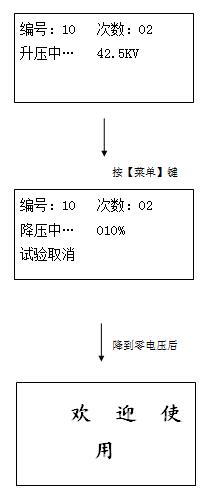 4.4、如儀器正在升壓,按【菜單】鍵后,儀器斷開主回路,LCD顯示“試驗取消,降壓中。。。。 ”,降到零電壓后,儀器顯示LOGO。